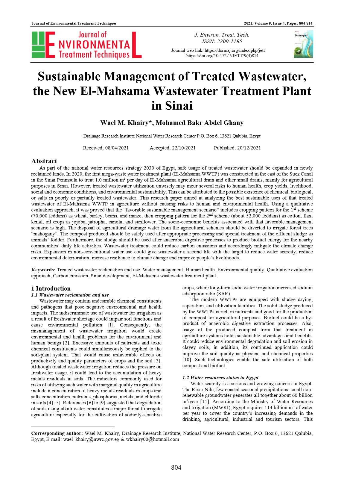 As part of the national water resources strategy 2030 of Egypt, safe usage of treated wastewater ...